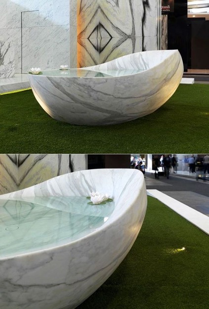 This conical form bathtub is made by an Indonesian interior designer, Marina Pandunata. The color of its marble is beige, and it has a separate wooden base, which is providing it an inimitable look. The bathtub outside has slightly rough surface, but the inside is smooth and has reviving feel and touch to it. It comes with a wooden tray for keeping bathroom essentials. An optional matching footstep is also available with it.